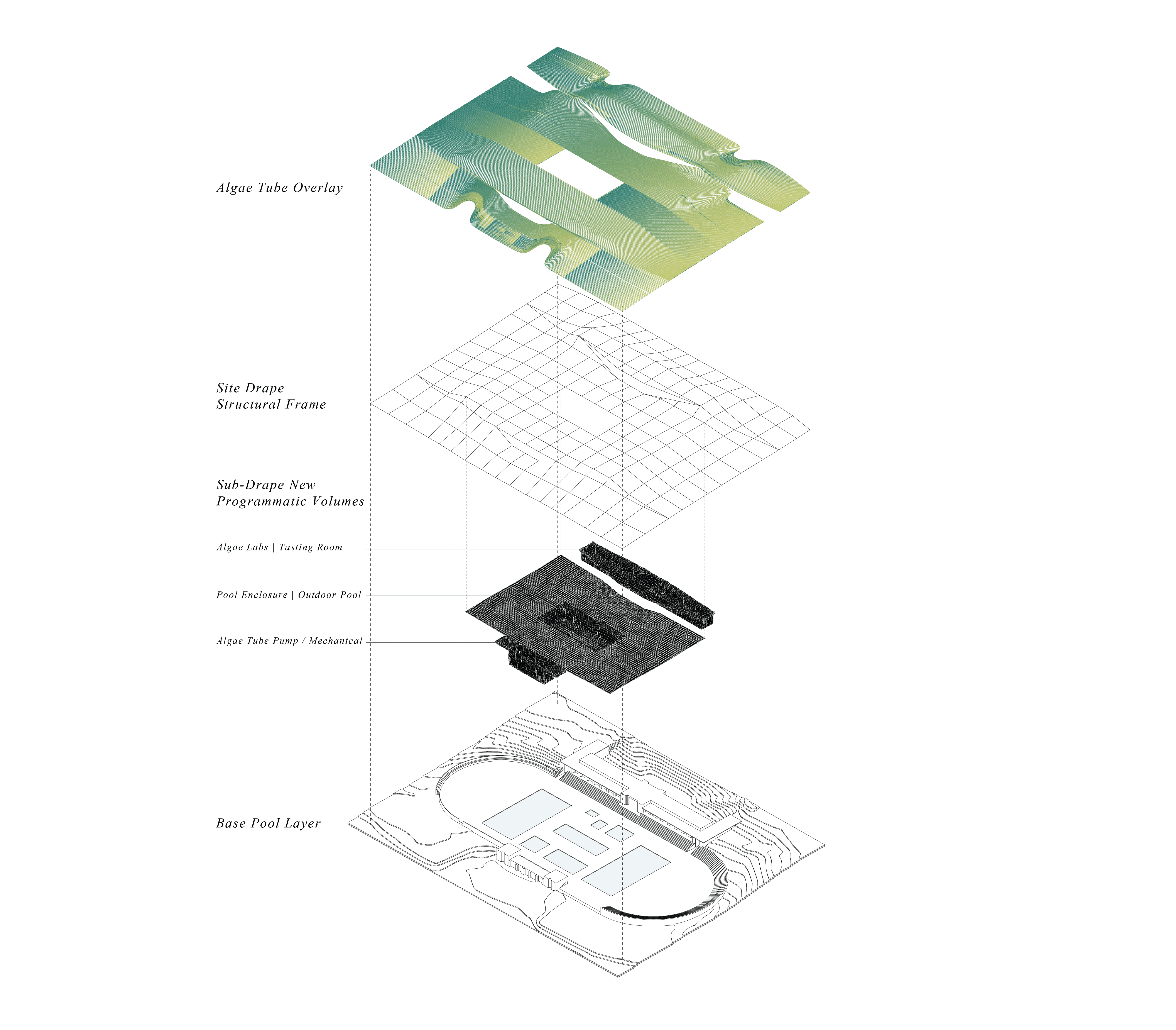 The Astoria Park Pool is the oldest and largest pool in New York City. Over the years the facilities have slowly fallen into a state of disrepair. This project proposes draping the pool with a productive layer of algae tubes that purify wastewater, clean oxygen, and create bio fuel. The algae production augments the existing program in a reciprocal relationship that gives the pool a new life.